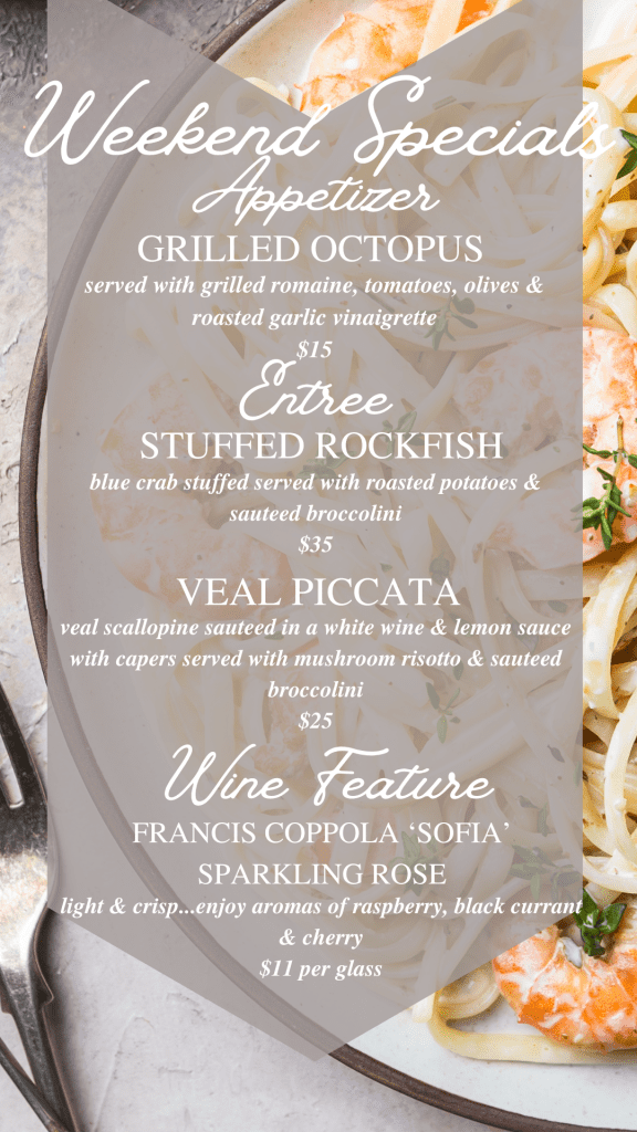 Casa Mias (“My House”) offers homemade Italian, Greek, American Food and of course, Colossal Lump Crab Cakes.
